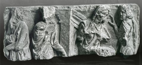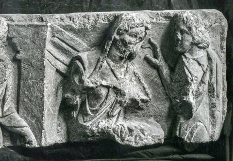- Szene in einem Innenraum mit Pfeiler und davon ausgendem Gesims; vor diesem sitzende (?) Frau mit Schleier, vor sich Korb (?); vor ihr stehende Frau (Jüngling ?) mit kurzem Haar. Links vom Pfeiler zwei sich den Rücken zuwendende Frauen in Tunica und Mantel