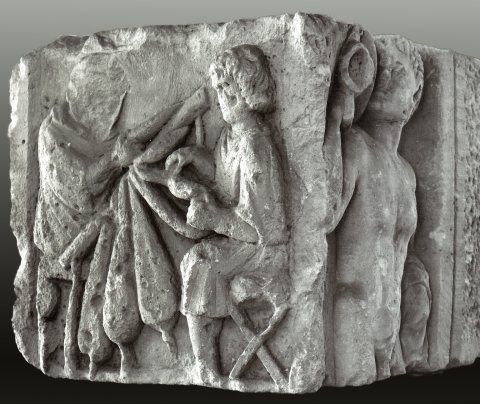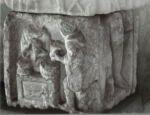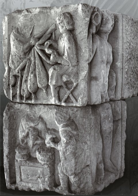 - Vorderseite: leeres, bossiertes Schriftfeld, linkes Seitenfeld mit Figur eines nackten jugendlichen Satyrs mit Tierohren, um den linken Arm Mantel, auf der rechten Schulter Amphore. Auf der links anschließenden Nebenseite zwei Bildfelder übereinander. Oben Werkstattszene (Verkaufsszene?). Auf einem Klapphocker sitzender Jüngling in halblanger Tunica, ihm gegenüber sitzender Mann; zwischen ihnen auf zwei Stützen schräg verlaufender Balken, über den sackförmige Objekte (Stoffe ?) mit zusammengebundenen Enden (?) hängen. Unten Verkaufsszene mit Händler hinter dem Ladentisch, auf dem zwei Säcke stehen; der Mann hält mit beiden Händen kegelförmigen Behälter. Von rechts herantretender Mann mit Gefäß (?) in den Händen.
