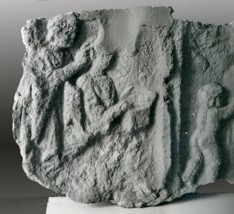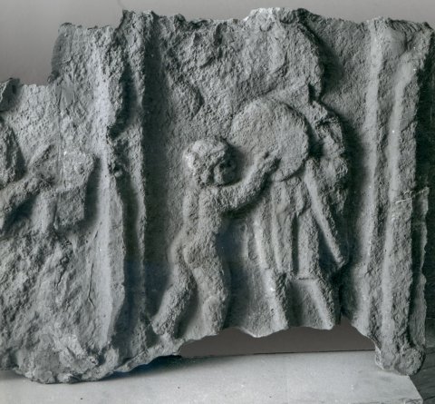 - Reste von zwei Bildfeldern nebeneinander. Links: Toiletteszene mit in Lehnsessel sitzender Frau mit Kästchen auf den Knien, hinter dem Sessel stehende Dienerin, die ihre Herrin frisiert. Rechts: nackter Knabe (Amor ?) hebt einen runden Schild zu einem Mann in kurzem Gewand hinauf. Der Kopfumriss des Mannes deutet auf einen Helm hin, an seiner Linken Seite Schwert (?). Mythos ?