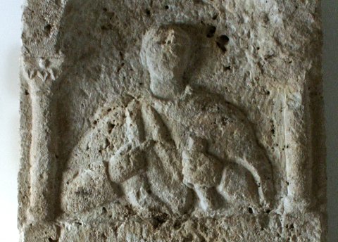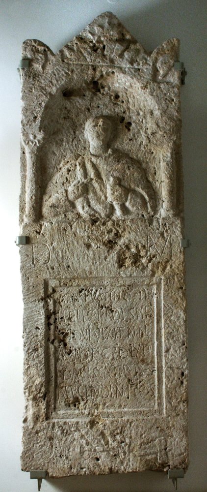 - Im Giebel Blattornament, Seitenakrotere mit Delphinen. Im Hauptbild Mann (Soldat). Unter Bogen auf Säulen Brustbild: bartlos, Ärmeltunica, Sagum, Scheibenfibel, in der Linken Rolle (volumen).