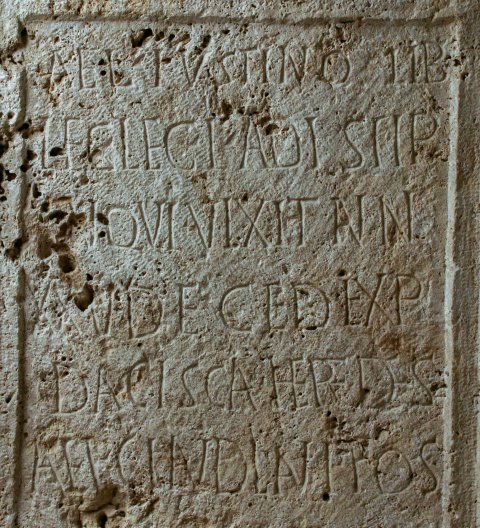 - D(is) M(anibus) // Ael(io) Iustino lib(rario) / leg(ati) leg(ionis) I adi(utricis) stip(endiorum) / V qui vixit ann(os) / XXV deced(it)(!) exp(editione) / Dacisca(!) heredes / Ael(ii) Claudiani pos(uerunt)