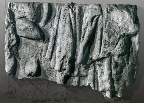 - Rest von zwei stehenden Ganzgiuren, links Mann, rechts Frau im Mantel. Zu ihrer Linken ursprünglich Rest eines Pultes (?), heute weggebrochen. An der rechten Seite des Mannes übereinanderliegende Ballen oder Säcke ?