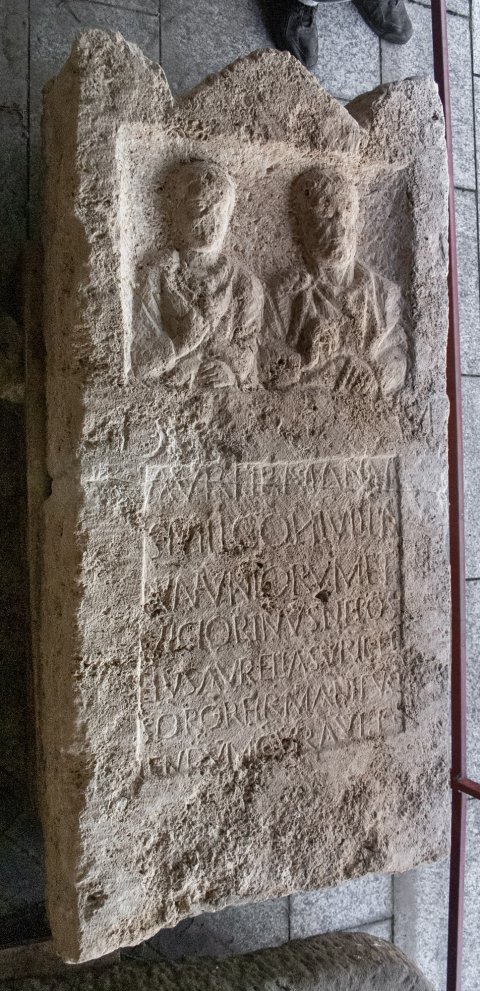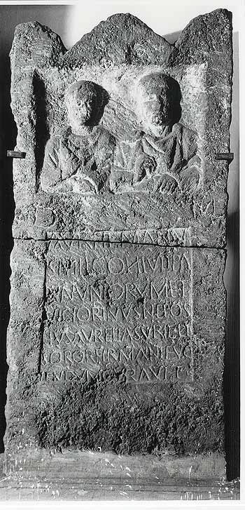 - In Rechtecknische zwei Brustbilder (Ehepaar). Links Frau in Ärmeltunica, Mantel. Rechts Mann: bärtig, Ärmeltunica, Sagum.