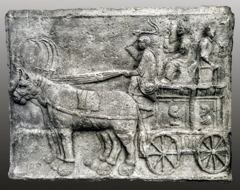 - Wagenszene: vierrädriger hoher Wagen mit stehendem Zweigespann nach links; über den Pferdeköpfen sichelförmige Aufsätze; auf dem Wagenkasten zwei Relieffelder mit männlichen Büsten; oben sitzen der Kutscher mit Peitsche und zwei Männer Rücken an Rücken (Beamter und Lictor ?).