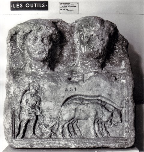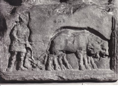 - Zwei Büsten (Ehepaar), darunter Mann mit von zwei Ochsen gezogenem Pflug.