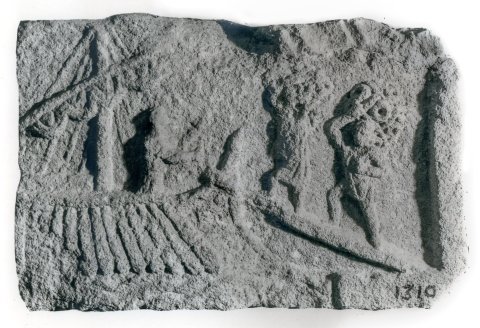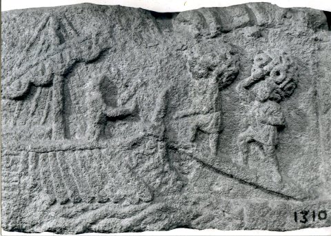 - Beladen eines Schiffes: einmastiges Schiff mit gerefftem Segel und Rudern; im Schiff stehender Mann, der zwei Männer erwartet, die über eine Planke kommend Lasten auf ihren Nacken tragen.