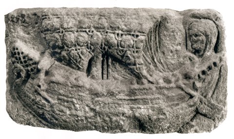 - Einmastiges Segelschiff mit Steuerruder und Schwanenprotome am Bug, ganz rechts über dem Heck großer weiblicher Kopf mit Schleier (Göttin ?). Oberfläche leicht gewölbt.