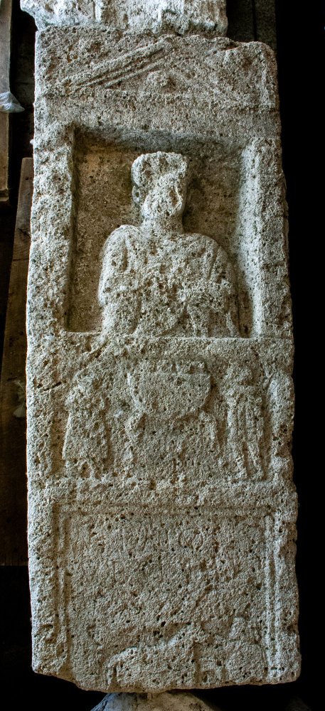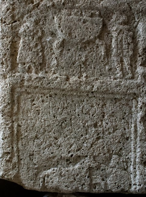 Eingeschriebener Giebel mit Rosetten. Im Hauptbild zwischen Pilastern Brustbild eines Mannes: bärtig, Sagum, Scheibenfibel. Zwischenbild mit Totenopfer: dreibeiniger Tisch mit Gefäßen, links Dienerin, rechts Diener.