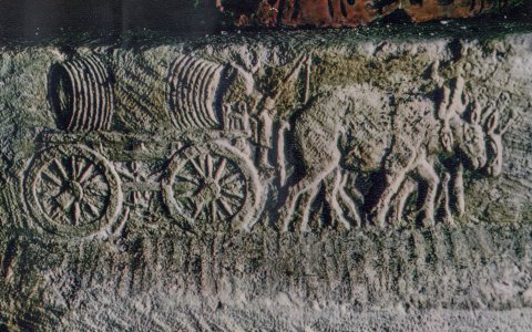 - Eckblock. Auf einer Seite Wagenszene: vierrädriger, von zwei Maultieren gezogener Wagen, auf der Ladefläche großes Fass, Kutscher mit Kapuzenmantel und Peitsche. Auf der rechts anschließenden Seite führt ein Mann zwei Maultierean einer Kette, rechts Reste von zwei Männern.