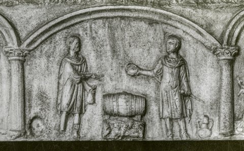 - Im Zentrum unter weitem Bogen auf Säulen Weinhändler und Kunde rechts und links von zwei liegenden Fässern. Der Händler reicht eine Schale, der Kunde Geld aus einem Beutel. Neben dem Händler stehende Amphore. In den seitlichen Bogennischen je eine mythische Figur: links jugendlicher Dionysos mit Thyrsos, Weintraube und hockendem Panther; rechts Mercur mit Flügelkappe, Caduceus und Geldbeutel, neben dem linken Fuß Hahn, neben dem rechten Ziegenbock. Seitlich Eckpilaster.