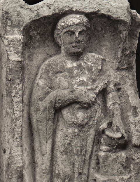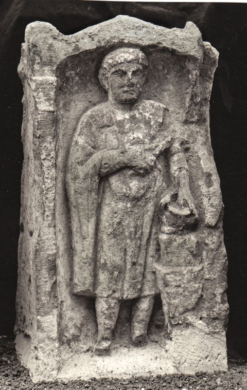 - Stele mit offenem Giebel mit Akroteren. Stehender bartloser Mann in halblangem Ärmelgewand, in der rechten Hand Werkzeug, in der linken Gefäß, unter diesem eckiger Ständer.