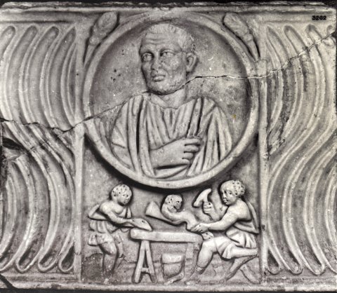 - Zwischen Riefeln rechteckiges Relieffeld, darin oben Medaillon mit Porätbüste eines bärtigen Mannes in Toga, darunter Werkstattszene mit Tisch, daran rechts sitzender Handwerker, der mit einem Hammer ein Tischbein mit Löwenprotome bearbeitet; links stehender Gehilfe mit Hobel; beide tragen kurze gegürtete Tunica mit entblößter rechter Schulter. Unter dem Tisch Gefäß oder Haustock ?