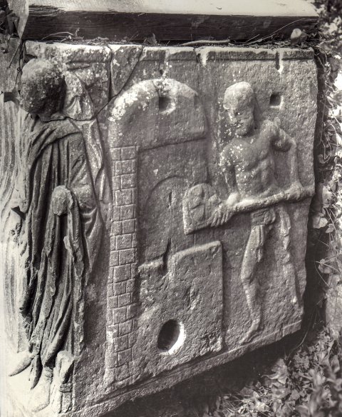 - Auf der Vorderseite zwischen Riefeln Medaillon mit zwei Halbfiguren (Ehepaar), darunter Szene mit zwei Arbeitern im Lendentuch, zwischen ihnen großer Bottich mit zwei Griffen. An den Ecken der Vorderseite stehen ein Mann in Toga und eine Frau im Mantel. Auf der linken Schmalseite Getreidemühle mit Pferd, auf der rechten Bäckereiarbeiter im Lendentuch mit Brotschaufel am Backofen.