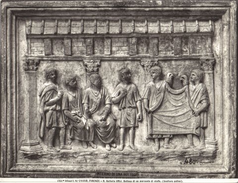 Vor den Pfeilern rechts zwei Männer in Ärmeltunica, der rechte auch mit Mantel, die einen Stoff oder Mantel präsentieren. Zwei Männer (Kunden) in Tunica und Mantel sitzen auf einer Bank, flankiert von zwei Männern (Diener) in kurzer Tunica , der linke mit Kapuenmantel. Alle sind bartlos.