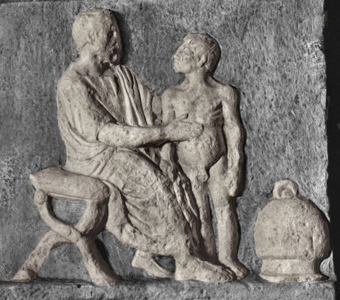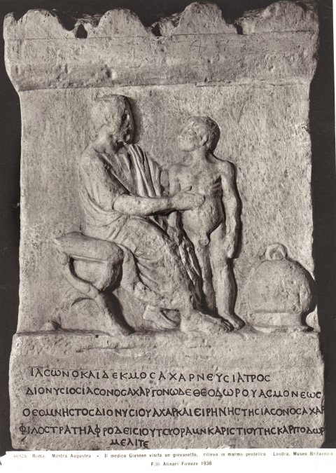 - Rahmenloses Bildfeld mit auf Klapphocker sitzendem bärtigen Arzt in Chiton und Mantel, der einen vor ihm stehenden nackten Knaben untersucht. Oben eckige Leiste und Reihe von glatten Akroteren, unter dem Relief Inschrift.