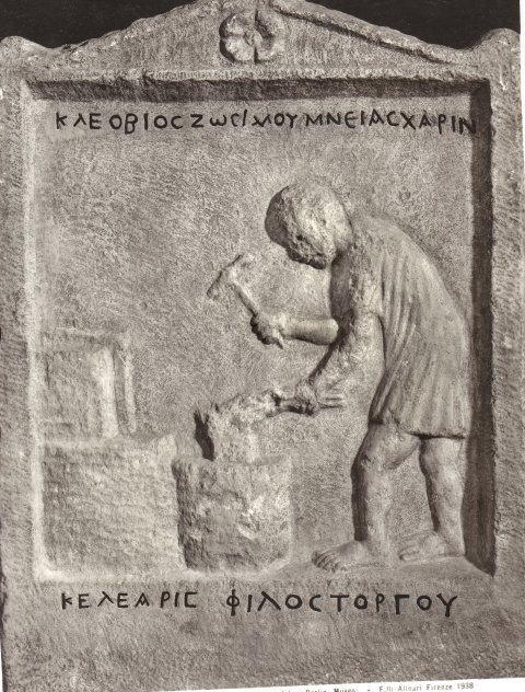 - Giebel mit Rosette und Eckakroteren. Rechteckiges Bildfeld mit vor dem Amboss stehendem bärtigen Schmied in kurzem Chiton, in der Rechten Hammer, in der Linken Zange mit Werkstück.