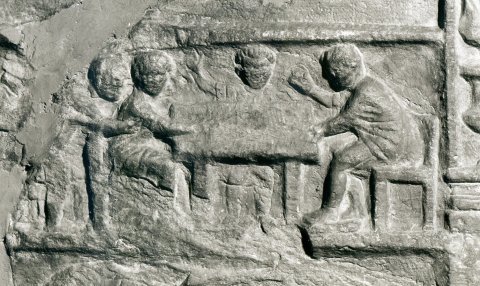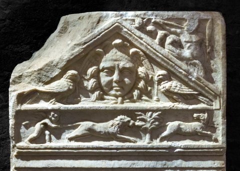 - Eingeschriebener Giebel mit Gorgoneion zwischen Vögeln, auf den Giebelschrägen Meerwesen (Triton). Zwischenfries mit Erot und Löwe, der ein Pferd verfolgt. Schriftfeld zwischen Pilastern mit Blattkandelabern, oben sitzende Vögel. Zwei Sockelbilder: oben drei um einen Tisch sitzende Männer beim Spiel, links stehender Zuschauer. Unten Mythos (Lupa Capitolina mit Romulus und Remus).