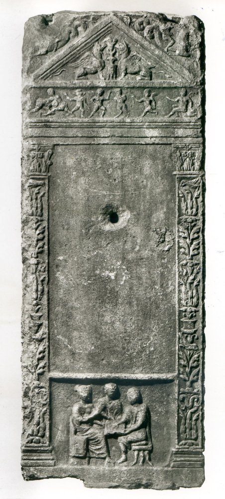 - Eingeschriebener Giebel mit Kandelaber zwischen hockenden Greifen, auf den Giebelschrägen Meerwesen. Zwischenfries mit spielenden Eroten und Pan. Schriftfeld zwischen Pilastern mit Blattkandelabern, unten durch horizontale Leiste abgetrenntes Sockelbild mit Frau auf Lehnsessel und Mann auf Hocker beim Brettspiel, zwischen ihnen stehender Diener (?).