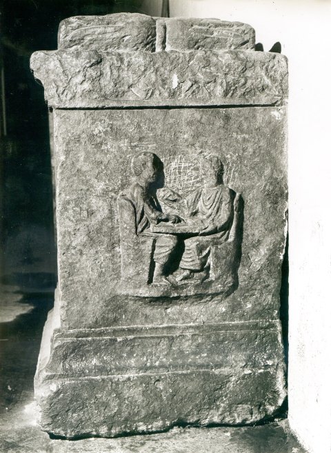 - Auf der linken Nebenseite Wagenszene mit Ehepaar auf zweirädrigem Wagen mit einem Zugpferd. Auf der rechten Seite zwei Männer (? Mann und Frau ?) beim Brettspiel.