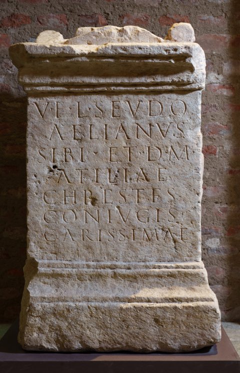 - V(ivus) f(ecit) L(ucius) Seudo() / Aelianus / sibi et d(is) M(anibus) / Atiliae / Chrestes / coniugis / carissimae
