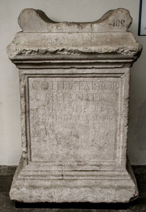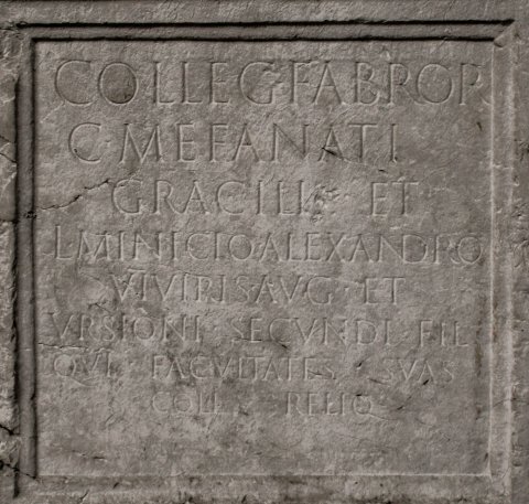 - Colleg(ium) fabror(um) / C(aio) Mefanati / Gracili et / L(ucio) Minicio Alexandro / VIviris Aug(ustalibus) et / Ursioni Secundi fil(io) / qui facultates suas / coll(egio) reliq(uerunt)