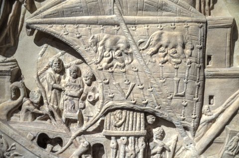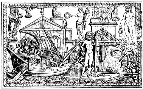 Über dem Schiff im Hintergrund Bogenmonument mit Elefantenquadriga. Lenker (Domitian ?) mit Kranz und Mantel, in der Linken Szepter, das in Menschenschädel endet. Links vom Schiff frontal stehender Neptun, bärtig, Dreizack in der linken Hand.