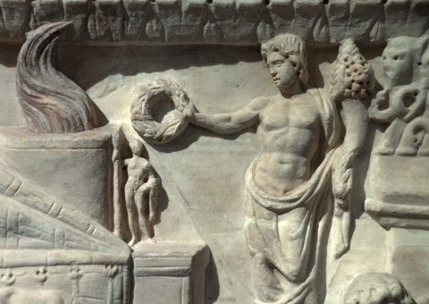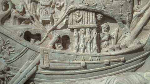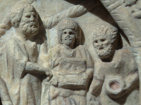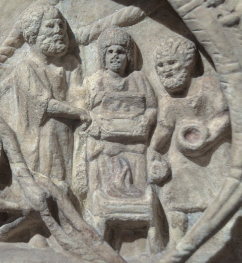 Auf dem Dach des zweifenstrigen Deckhauses drei Personen (Familie des Kapitäns?) beim Opfer. Links davon Steuermann mit Pinne des Steuerruders, das aus einem massiven Kasten steuerbord herausragt. Auf dem Heck Statuette der Victoria mit Kranz. An der Bordwand figürlicher Dekor: Geburt der Venus (?) am Heck und Dionysos am Bug. Unter dem Heck Beiboot mit einem Mann Besatzung.