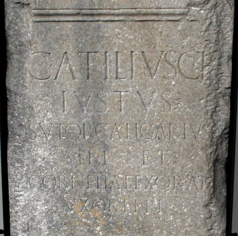 - C(aius) Atilius C(ai) f(ilius) / Iustus / sutor caligarius / sibi et / Corneliae Exorat(ae) / uxori t(estamento) p(oni) i(ussit)
