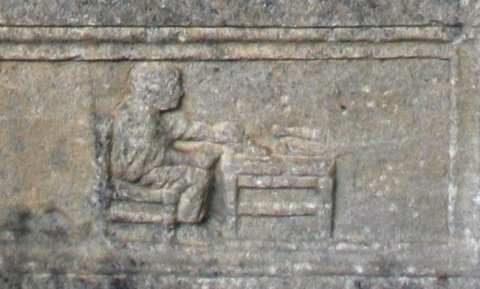 - Eingeschriebener Giebel mit Gorgoneion, auf denSchrägen Meerwesen (Delphin ?). Unter dem gerahmten Schriftfeld gerahmtes Sockelbild mit sitzendem Schuster bei der Arbeit.