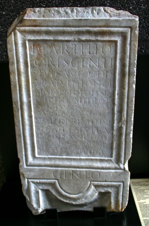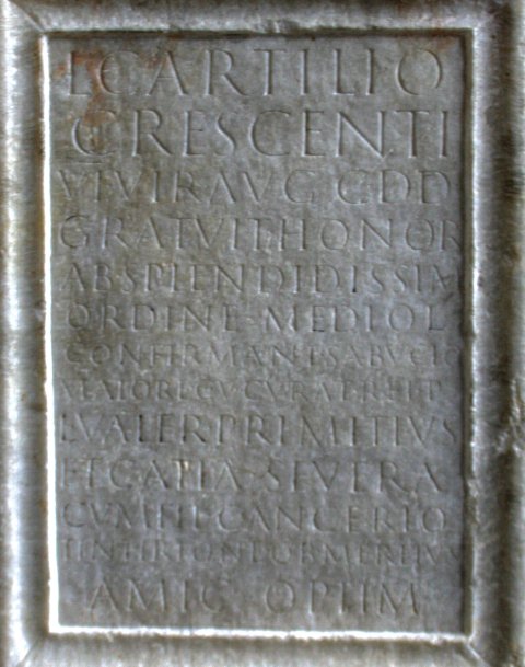 - L(ucio) Cartilio / Crescenti / VIvir(o) Aug(ustali) c(reato) d(ecreto) d(ecurionum) / gratuit(o) honor(ato) / ab(!) splendidissim(o) / ordine Mediol(aniensium) / confirmant(e) Sabucio / Maiore c(larissimo) v(iro) curat(ore) rei p(ublicae) / L(ucius) Valer(ius) Primitivus / et Catia Severa / cum fil(io) C(aio) Ancerio / Tintirione ob mer(ita) eius / amic(o) optim(o) // Genio