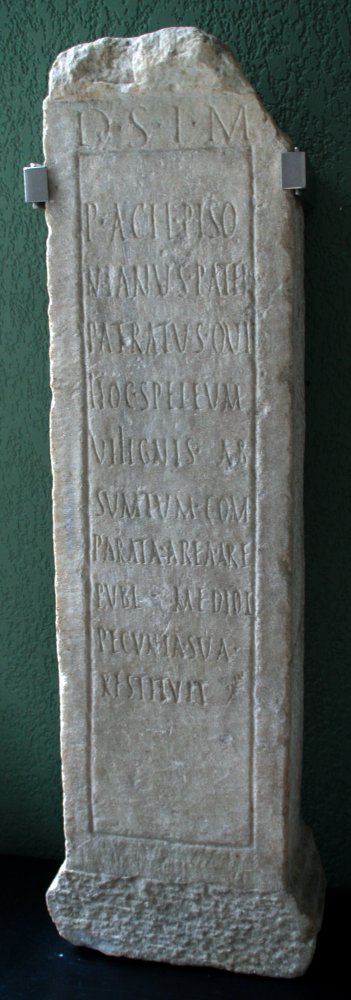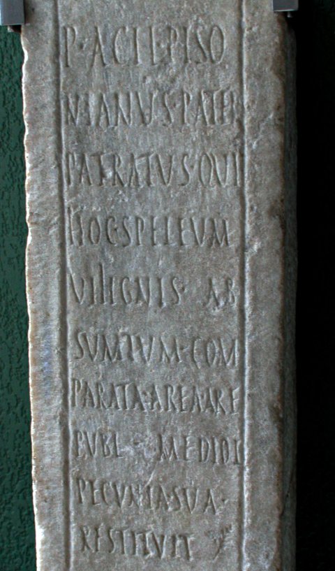 - D(eo) S(oli) I(nvicto) M(ithrae) / P(ublius) Acil(ius) Piso/nianus pater / patratus qui / hoc spel(a)eum / vi {i} ignis ab/sum(p)tum com/parata area a re / publ(ica) Mediol(aniensium) / pecunia sua / restituit