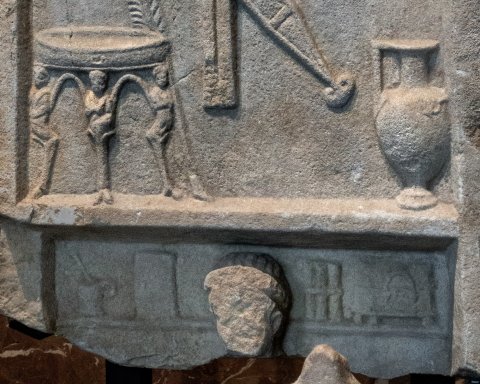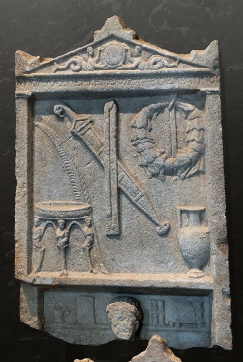 Oberes Feld: Becken auf Tierbeinen mit menschlichen Protomen, Palmzweig, aufgehängte Waffen (Schwert in Scheide mit Peltenortband, Gürtel?), Kranz mit Tänien, darunter Kanne.