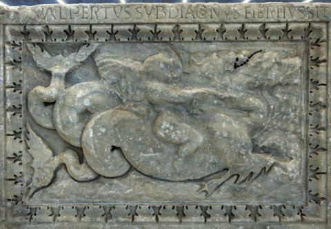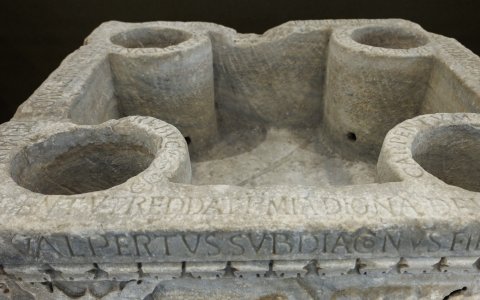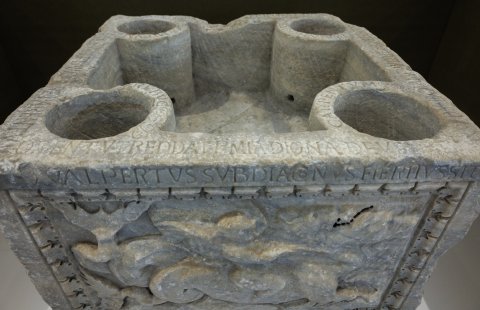 - Walpertus subdiaconus fieri iussit // Hoc fabricavit opus Walp(er)tus amore parentum / orent ut reddat pr(ae)mia digna deus / quod Mediolano multo deferre labore / hic studuit cupiens obtinuisse suo // Vade dormitum / rebuc / carpentum / bona nocte