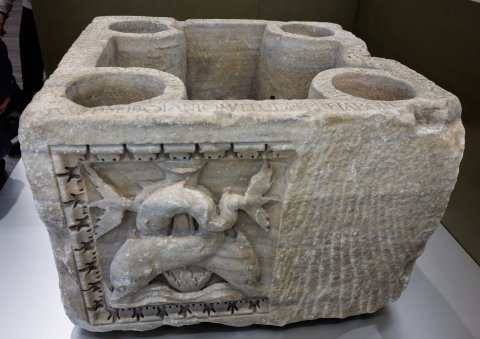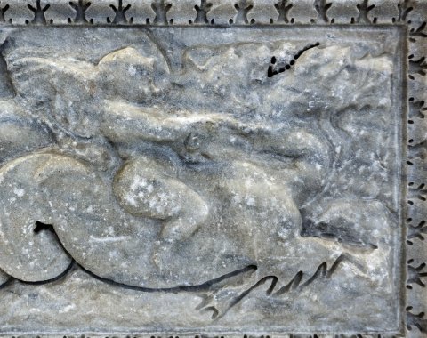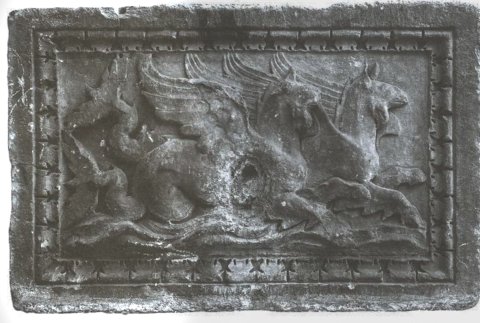 Viereckige Aschenkiste mit zylindrischen Halterungen für Urnen in den Ecken. Meerwesen. Auf der Vorderseite auf einem Seedrachen reitender Erot, auf der nur halbfertigen rechten Seite zwei verschlungene Delphine, auf der linken Seite zwei Seegreife. Bildfelder mit Kyma gerahmt.