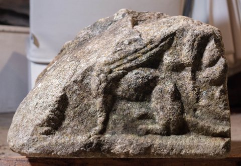 - Oberseite großflächig abgebrochen, sekundär abgearbeitet, Mörtelreste im Klammerloch