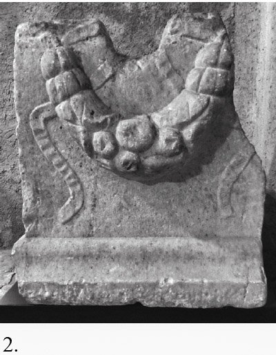 - Auf der Vorderseite tabula ansata mit Peltenhenkeln, auf der erhaltenen Nebenseite Fruchtgirlande.