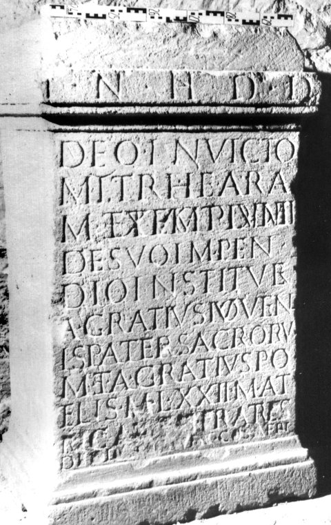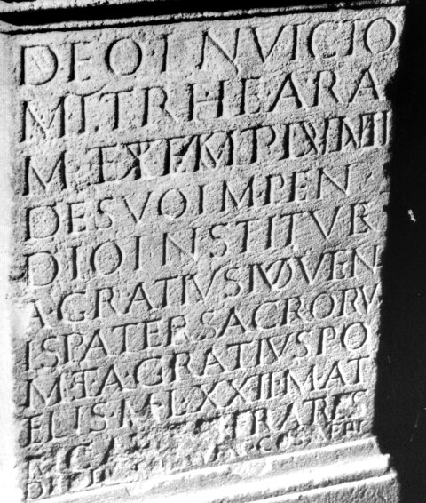 - In h(onorem) d(omus) d(ivinae) // deo Invicto / Mytrh(a)e(!) ara/m [[et templum]] «ex voto dei» / de suo impen/dio instituer(unt) / A(ulus) Gratius Ioven/is pater sacroru/m et A(ulus) Gratius Po/tens m(iles) l(egionis) XXII mat/rica[ri]us fratres / dedic[aver]unt co(n)s(ule) Afri(cano)