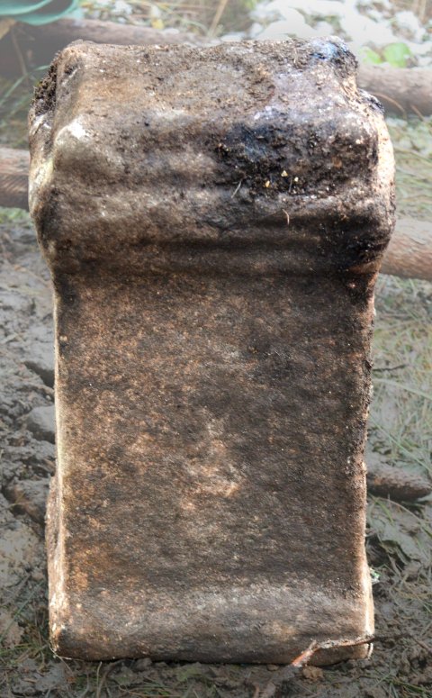 - Altar mit profilierter Basis und Deckplatte, Eckakrotere, in der Oberseite runde Schale