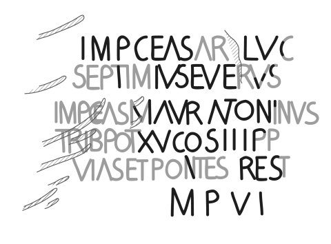 - Imp(erator) Ceas[ar](!) Luc(ius) / [Sep]t[im]ius Seve[r]us / [Imp(erator) Caes(ar)] m(arcus) Aur(elius) Antoni[nus] / [trib(unicia) pot(estate)] XV co(n)s(ul) III p(ater) [p(atriae)] / [vias et po]n[tes] res[t(ituerunt)] / m(ilia) p(assuum) VI