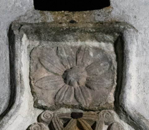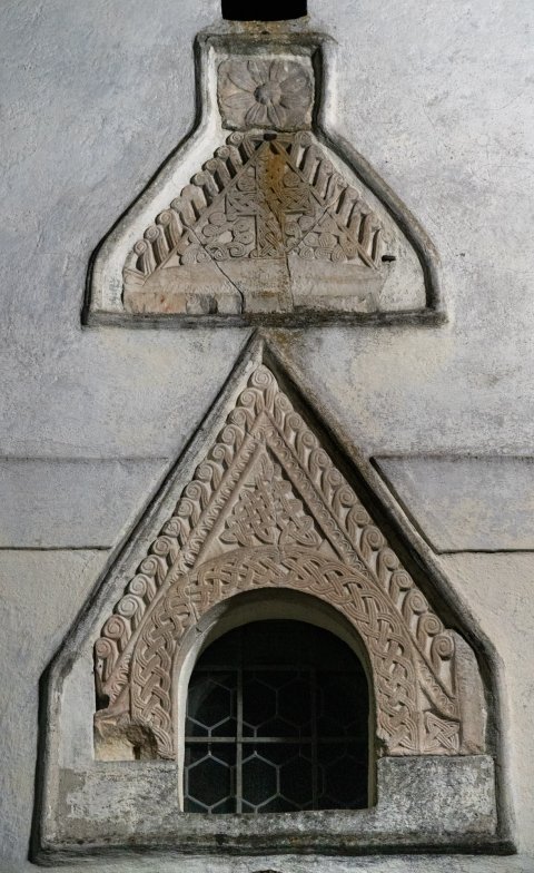- an der Westfassade der Kirche über dem oberen Flechtwerkstein