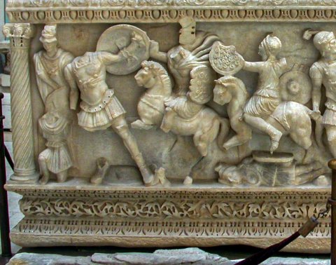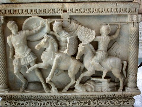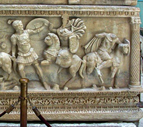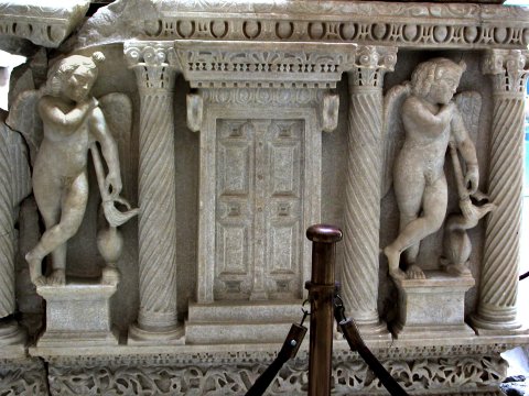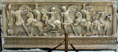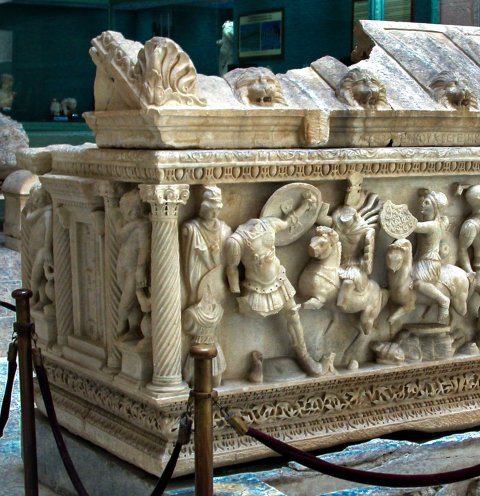 - Mythos. Dachförmiger Deckel mit Löwenkopfwasserspeiern und Palmettenakroteren; Kasten mit Säulen mit Spiralkanneluren an den vier Ecken; auf den Längsseiten und einer Schmalseite Amazonomachie, auf der zweiten Schmalseite Tür zwischen Säulen, seitlich je ein auf Podest stehender Trauergenius mit gesenkter Fackel, unter dieser Delphin.