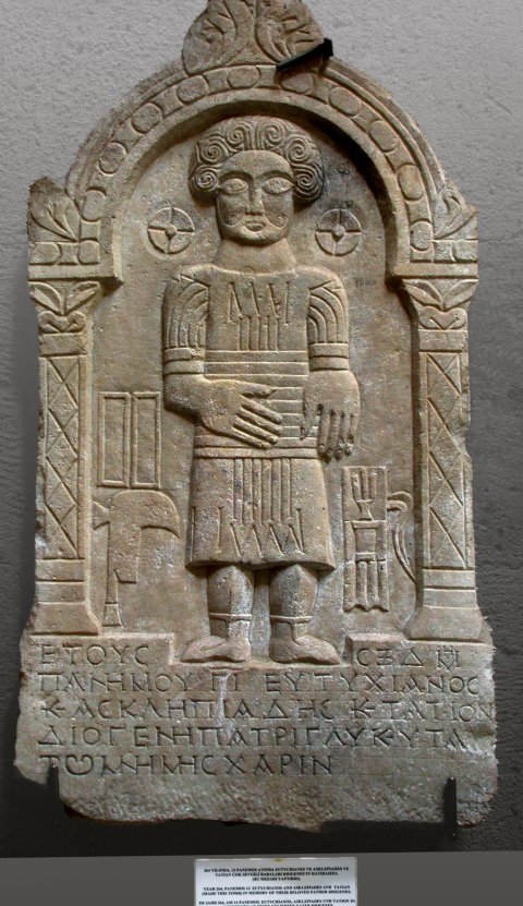 - griechisch: ἔτους σ ξ δʹ μη(νὸς) / Πανήμου ΓΙ Εὐτυχιανὸς κὲ Ἀσκληπιάδης κὲ Τάτιον / Διογένη πατρὶ γλυκυτά/τῳ μνήμης χάριν