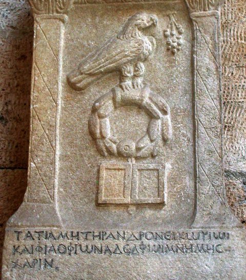 - griechisch. Τατία μήτηρ Ἀνδρονείκω υἱῶι / καὶ Φιλοφίῶν ἀδελφῶι μνήμης / χάριν