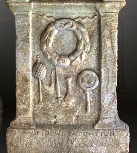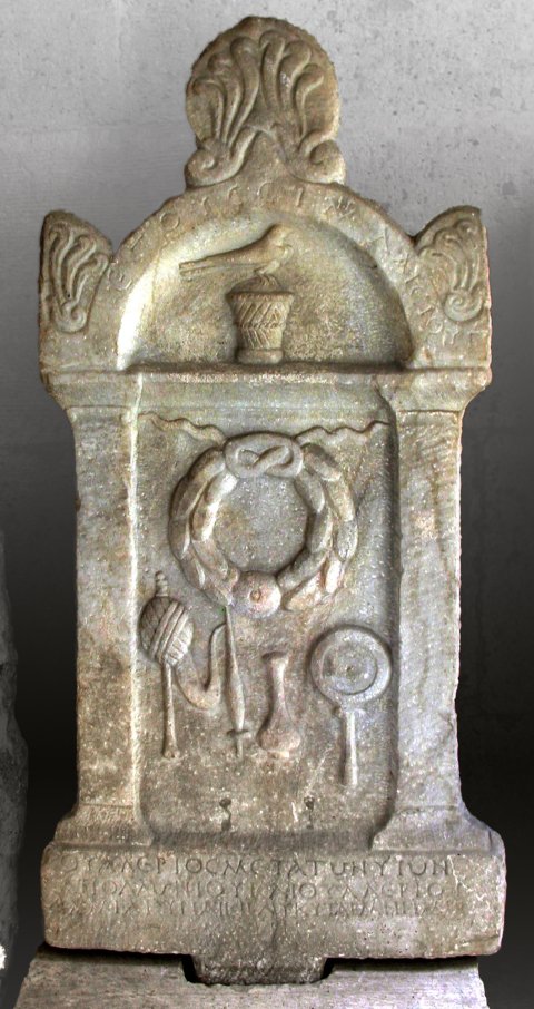 - Bogen mit Palmettenakroteren, im Bogenfeld Vogel auf einem Wollkorb (Kalathos). Bildfeld zwischen Pilastern, darin Kranz mit Tänien und Clipeus, darunter Rocken, Spindel, Fläschchen und Griffspiegel. Inschrift unter dem Relief.