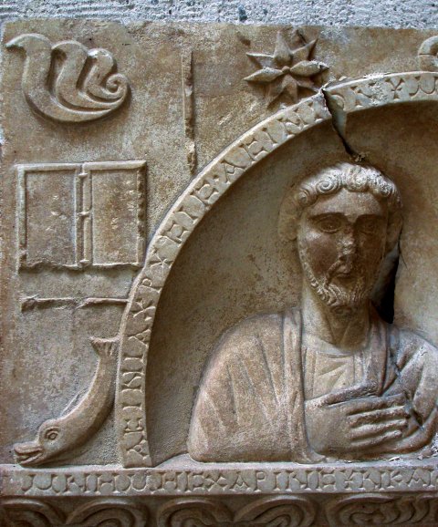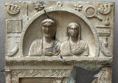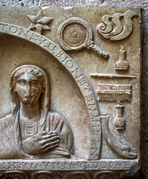 - Stele mit horizontalem Abschluss; oben rahmenloses Rechteckfeld, darin gerahmte Bogennische mit zwei Brustbildern (Ehepaar): links bärtiger Mann im Mantel, rechts Frau mit über den Kopf gezogenem Mantel. Seitlich des Bogens Geräte (Diptychon, Stili, Griffspiegel, Fläschchen, Kamm), unten je ein Delphin, oben Rosetten, in den Ecken Halbpalmetten. Unterhalb Türrelief: Flügeltür, in den Feldern Geräte (Schreibzeug, Wollkorb-Kalathos), auf dem Türrahmen Efeuranken. Inschrift auf dem Bogenrahmen, dem Gesims über der Tür und auf dem unteren Stelenrand.
