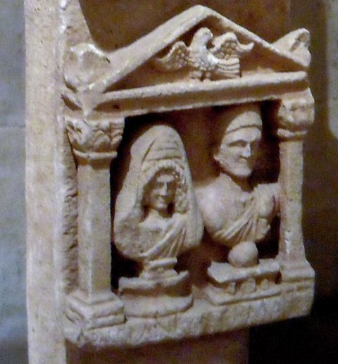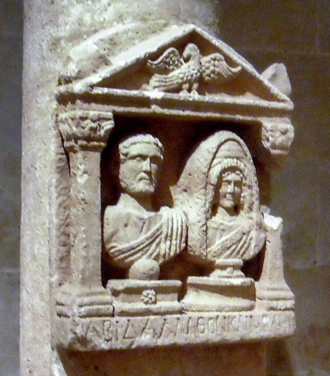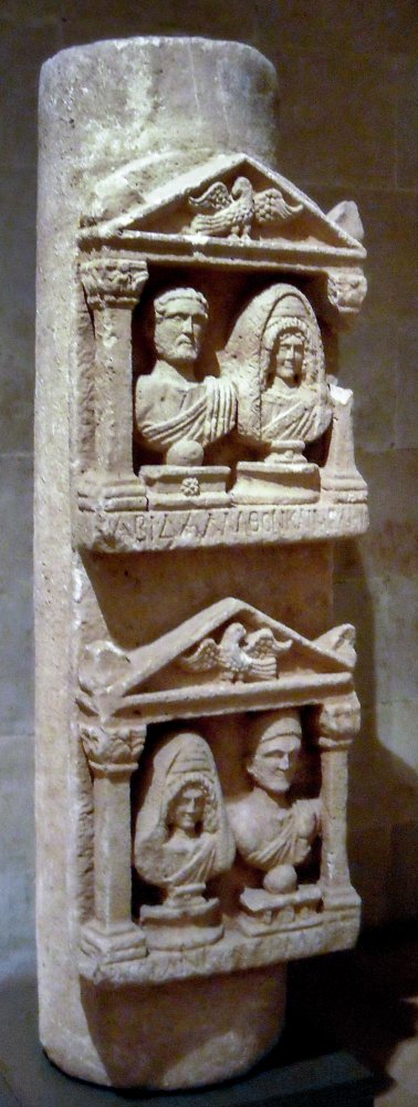 - Säulenschaft mit zwei vorkragenden Grabreliefs. Beide mit Giebel mit Eckakroteren und Adler im Giebelfeld. Darunter jeweils zwei Büsten (Ehepaar), flankiert von Pfeilern mit Blattkapitell und profilierter Basis. Die bärtigen Männerbüsten ruhen auf einem Globus über eckigem Podest mit Rosette, die der Frauen mit hoher Haube und Schleier auf eckigem Sockel mit Rosette über rundem Podest. Inschriften auf den Standleisten.