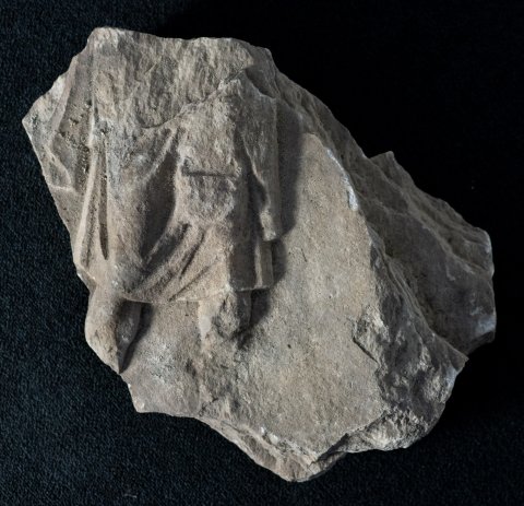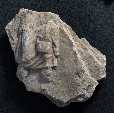 - Stehender Diener (Librarius - Scriba ?) in kurzer Tunica, in der Hand Tasche oder zusammengeklapptes Polyptychon ?