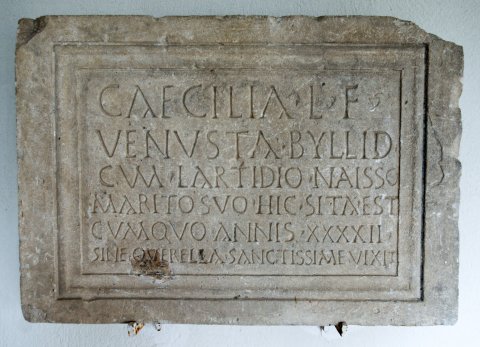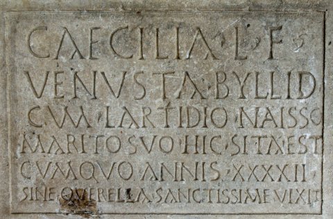 - Caecilia L(uci) f(ilia) / Venusta Byllid(ensis) / cum Lartidio Naisso / marito suo hic sita est / cum quo annis XXXXII / sine querella sanctissime vixit
