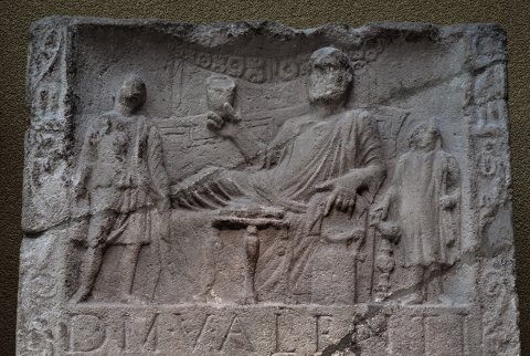 - Totenmahl: auf Kline gelagerter bärtiger Mann im Ärmelgewand, in der Rechten Becher, Vor der Kline Tischchen und große Henkelkanne. REchts stehender kleiner Diener mit Kanne und mappa, links Mann in kurzer Tunica, Mantel auf der linken Schulter, in der Rechten Tasche (Schreibtafel ?). Oben Blütengirlande, auf den seitlichen Rahmenleisten Ranken, darüber je ein Bildfeld mit Trauergenius oder Attis ?