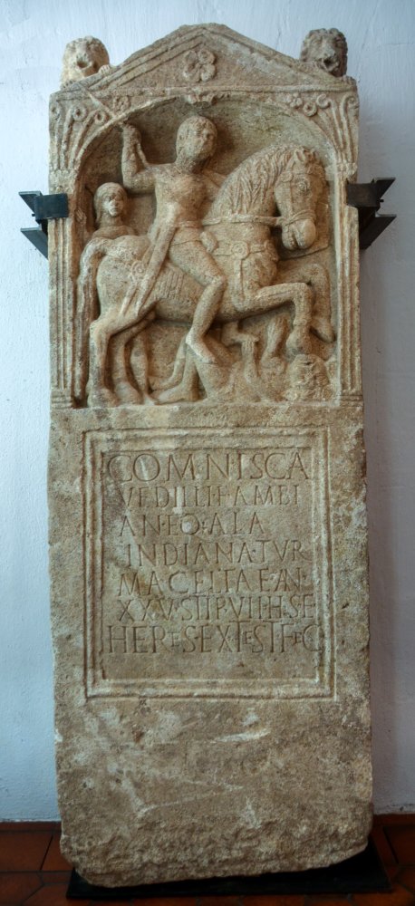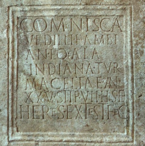 - Comnisca / Vedilli f(ilius) Ambi/an(us) eq(ues) ala / Indiana tur/ma Celtae an(norum) / XXV stip(endiorum) VII h(ic) s(itus) e(st) / heres ex test(amento) fec(it)